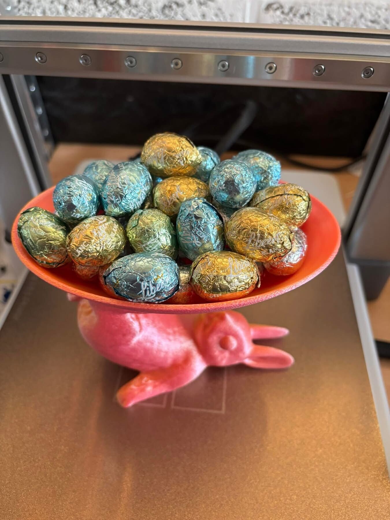 3 d geprinte paashaas met bakje om bv kleine eitjes te presenteren op tafel geprint met details van de pels van de paashaas ook andere kleuren verkrijgbaar deze kost slechts 9,95 euro