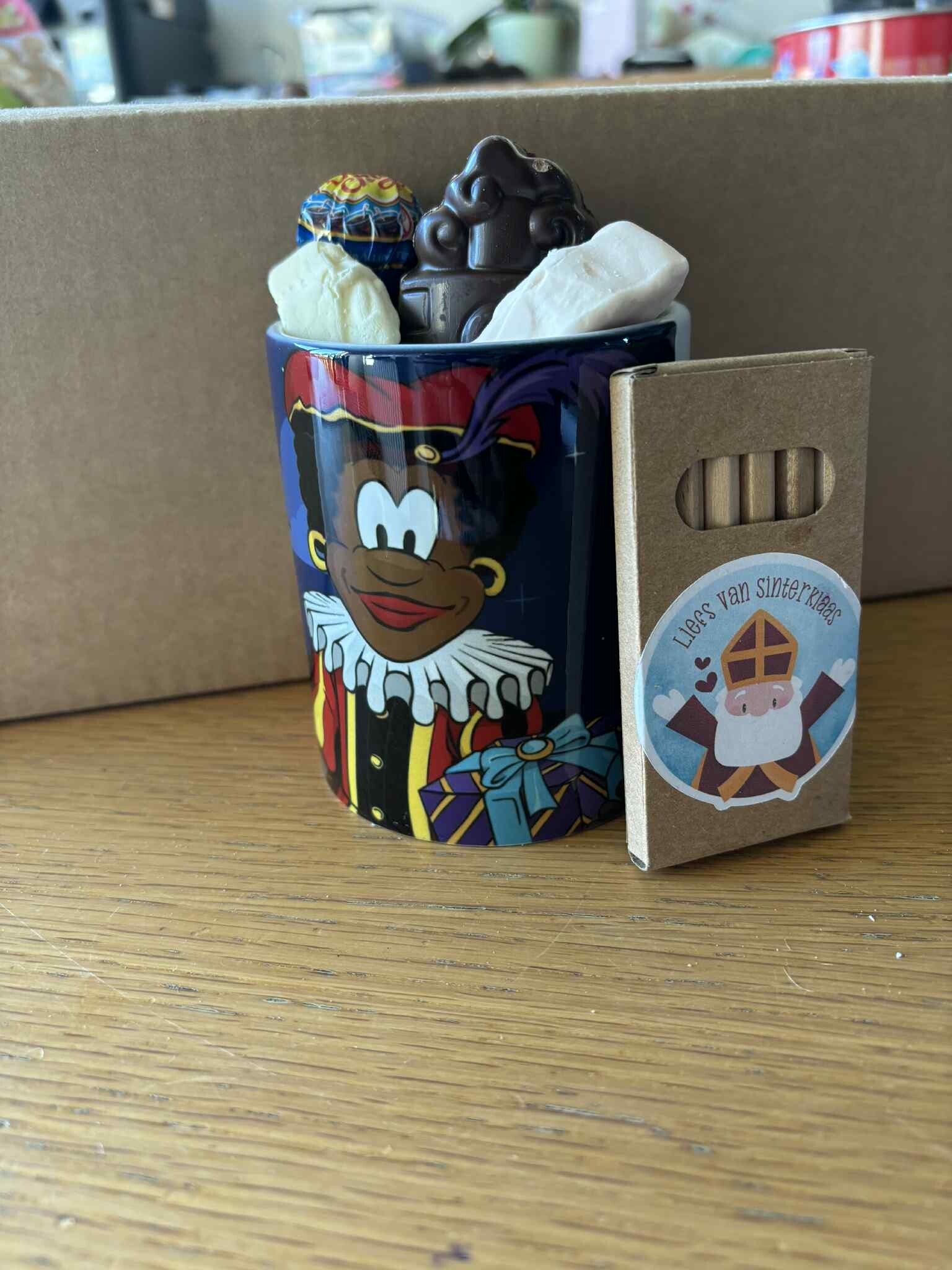deze leuke wite mok met figuur sint en piet kan je zowel leeg als gevuld bestellen
